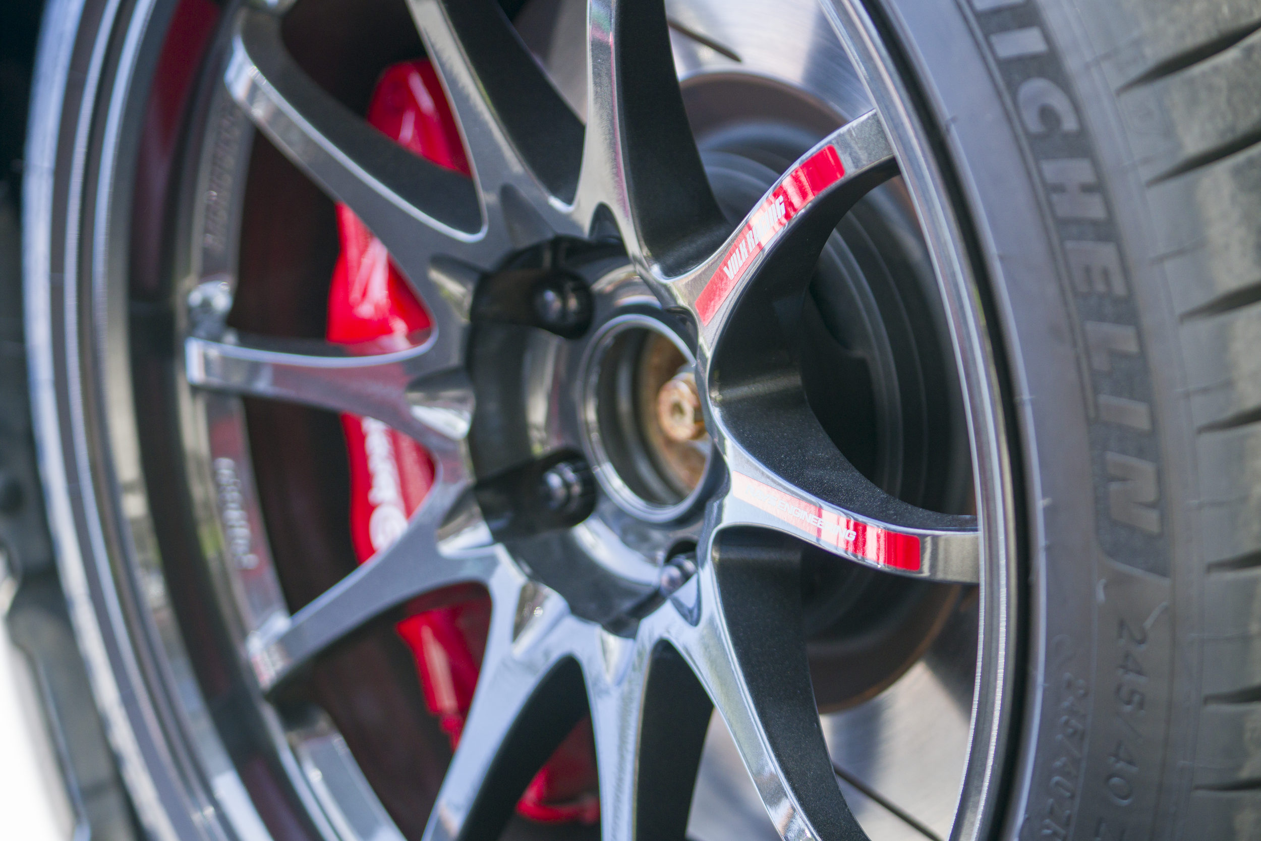 A group of race cars parked in a multi-level parking garage, featuring colorful and custom designs.